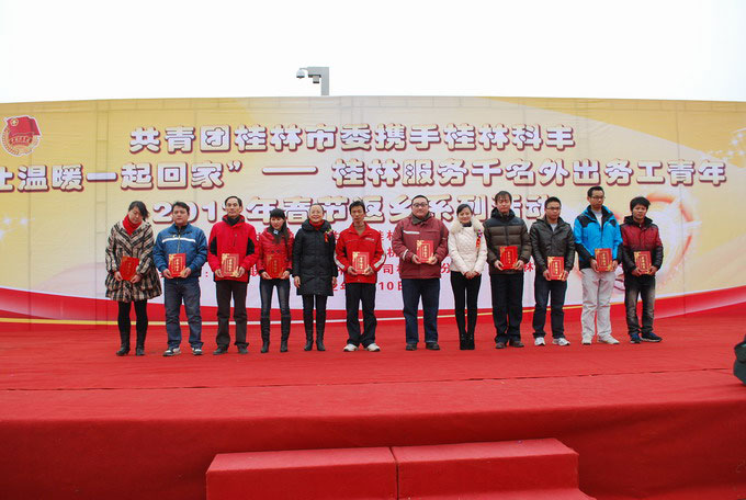 1月10日,團(tuán)桂林市委攜手桂林科豐在市中心廣場(chǎng)舉行“讓溫暖一起回家”桂林服務(wù)千名外出務(wù)工青年春節(jié)返鄉(xiāng)系列活動(dòng),市人大常委會(huì)副主任魯圣發(fā)出席,并為優(yōu)秀進(jìn)城務(wù)工青年頒獎(jiǎng)。