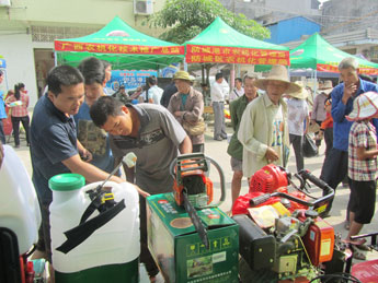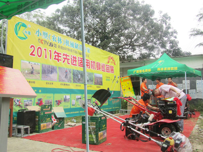 此次活動(dòng)特邀了廣西桂林高新區(qū)科豐機(jī)械有限責(zé)任公司、廣西五菱南寧桂花車輛有限公司、廣西柳州五菱柳機(jī)動(dòng)力有限公司等10家農(nóng)機(jī)生產(chǎn)企業(yè),組織36名技術(shù)人員和13輛宣傳大蓬車,帶上手扶式水稻插秧機(jī)、微型耕整(作)機(jī)、小型植保機(jī)、背負(fù)式水稻(甘蔗)收割機(jī)、手提式電鋸等11個(gè)品種46臺(tái)套(件)先進(jìn)適用農(nóng)機(jī)具、各種宣傳資料等,以防城區(qū)的華石鎮(zhèn)為宣傳展(演)示始點(diǎn),分別到了峒中鎮(zhèn)、里火邊境村莊、東興市的馬路鎮(zhèn)等9個(gè)鄉(xiāng)、鎮(zhèn)(街、村),行程720公里。
