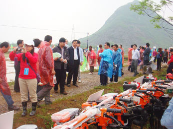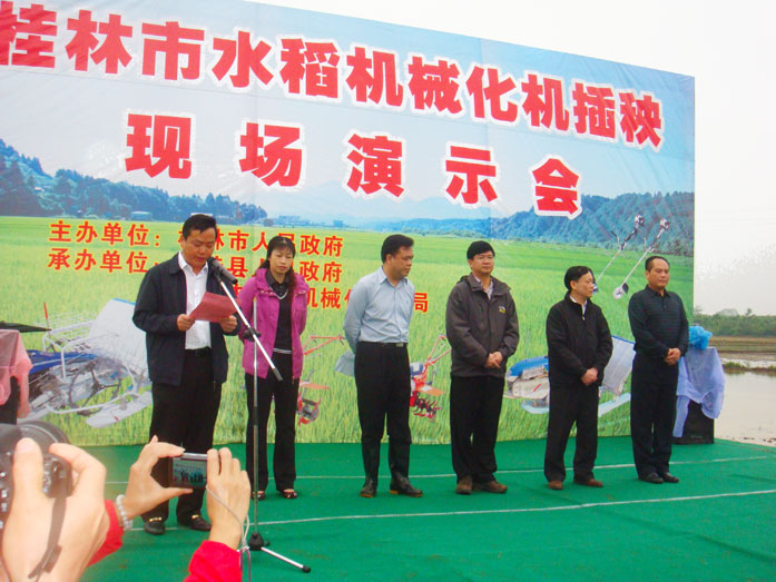 科豐公司受邀參加4月23日桂林市人民政府在臨桂縣四塘舉辦的《桂林市2012年水稻機(jī)械化插秧現(xiàn)場演示會》,桂林市副市長王建毅、市農(nóng)機(jī)局局長毛義德,臨桂縣委書記彭代元,縣委常委、縣紀(jì)委書記劉修榮出席會議。全市12個縣的分管領(lǐng)導(dǎo)、農(nóng)技服務(wù)中心主任、農(nóng)機(jī)管理員、農(nóng)機(jī)大戶和糧食種植大戶代表等共500多人參加了現(xiàn)場演示會;科豐展出的“科豐牌”多功能收割機(jī)、多功能微耕機(jī)、噴霧機(jī)等現(xiàn)場演示得到在場人員的一致肯定。